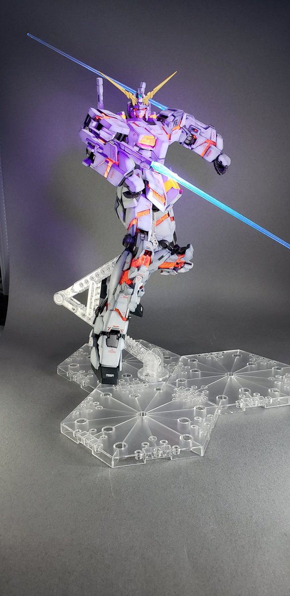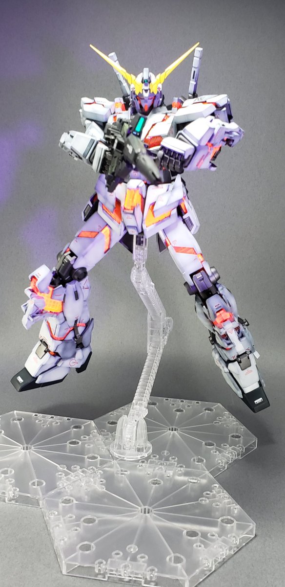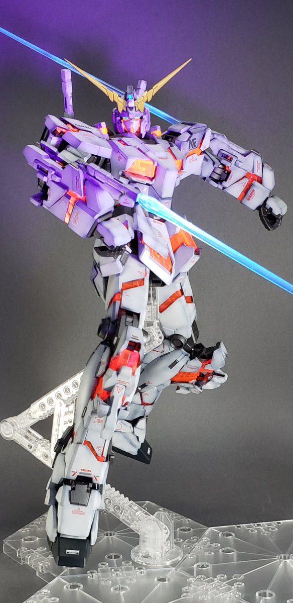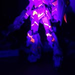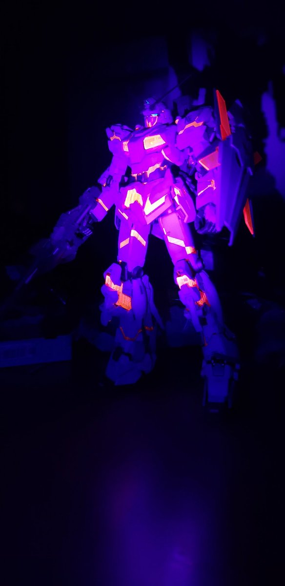 MGユニコーン。蛍光塗料とブラックライトで遊んでみる。サイコフレームが鮮やか。 #蛍光塗料 #ブラックライト #ガンプラ #ガンプラ好きと繋がりたい #ガンプラの画像貼るとRTされると聞いて #ユニコーンガンダム
