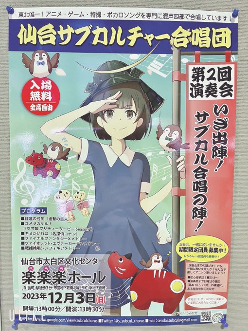 本日8/7〜8/20まで第一弾として、泉中央駅、地下鉄仙台駅、地下鉄長町駅の構内にて、描かせていただきました『仙台サブカルチャー合唱団様』のポスターが掲出されております🚃 写真は泉中央駅構内になりますが、改札前情報ボードに掲示いただいてますので、お近くの方は是非チェックしてみてください✏️