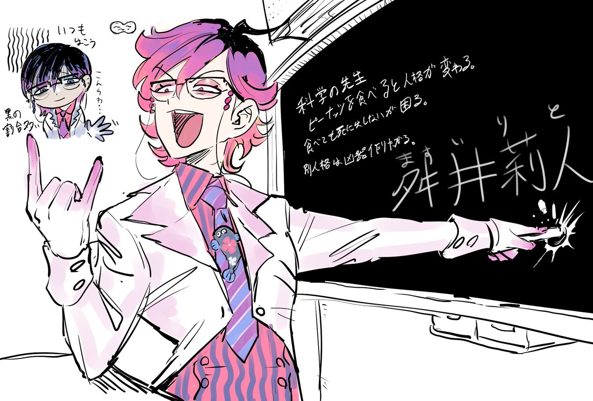 #予算戦争実行委員会 科目:科学 舛井 莉人(ますい りと) 科学の教師にして科学部・パラジットの顧問。 ピーナッツを食べると人格が変わってしまう。 血色良く自信に溢れた人格は「希望相」血色が悪く悲観的な人格が「不安相」と呼ばれる。 「逃避する紫陽花」という実験を成功させたらしいが…