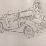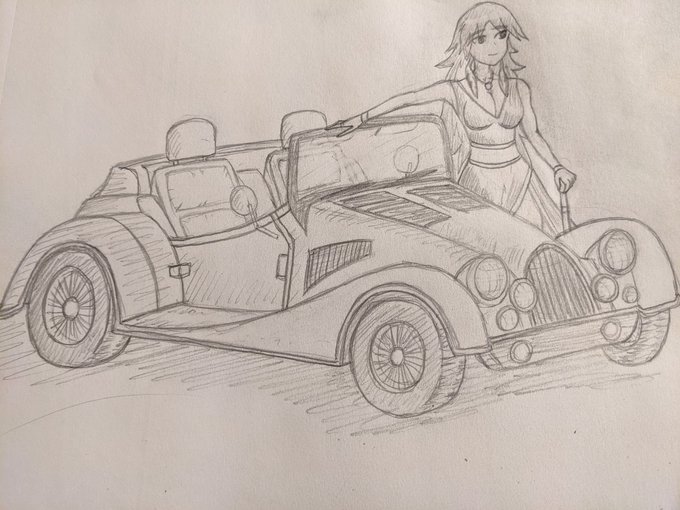 #artsofashes #kfp I don't have as much time as I used to to draw. So have a little sketch I did of Kiara and a Morgan GT. Classic style, modern comfort and safety. (Sorry for the scuff).
