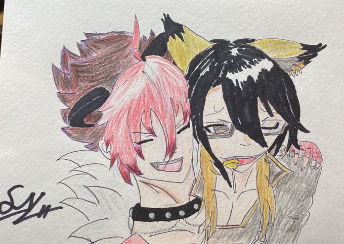 🦔「ヤイヤイ‼︎ 美味そうなの食ってるじゃねぇか‼︎ 俺様にも寄越しやがれ♪」 🦊「ムッ!? クロウか。この飴は、龍狐無想神威流で編み出した一品。これに目を付けるとは流石は堕天使と言えよう。」 #SB69 #イラスト #色鉛筆画