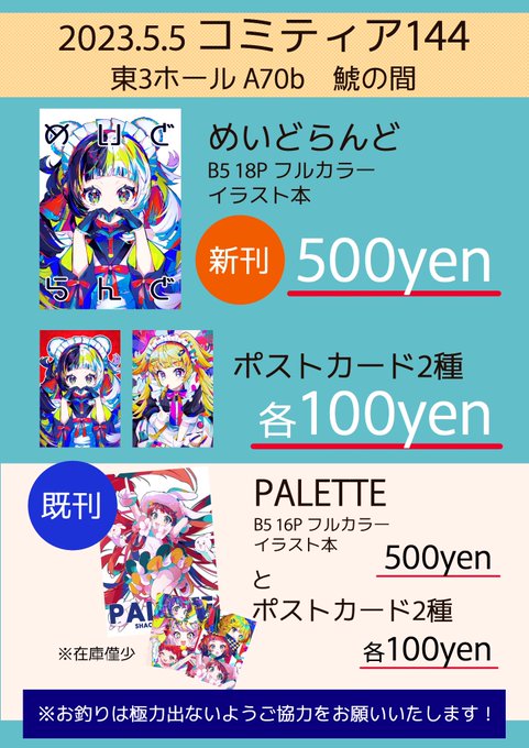 5/5(金) 東京ビッグサイトで開催されます#コミティア144 のお品書きです🖋 関コミで頒布したイラ本とポストカードもちょっとあるので持って行く予定です ささやかですが無料配布もあるのでお気軽にお越しくださいませ! スペースNo:A70b【鯱の間】 でお待ちしております〜☺️ #COMITIA144