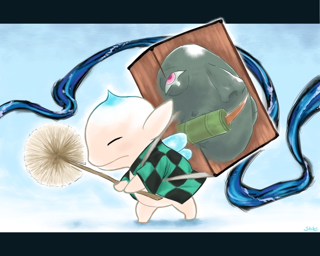 Inktober day 4! It's been a while since I made something a bit cursed, so here, have an impossible crossover of Puck and Becchi with Tanjiro and Nezuko. I decided it'd be better with color this time. #inktober2021 #Inktober #Berserk #kimetsunoyaiba