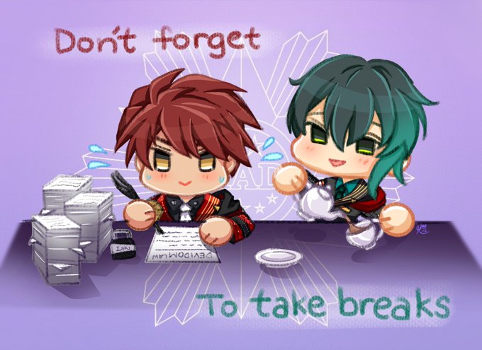 『Gotta finish up work before the celebrations start!』 『Don’t forget to take breaks too, my lord.』 『記念お祝いが始まる前に仕事終わせなきゃ!』 『殿下,休憩もお忘れずに。』 #obeyme #obeymejp #obeymefanart #rkgk #doodles #HDD2021 #おべいみー #おべいみー好きさんと繋がりたい