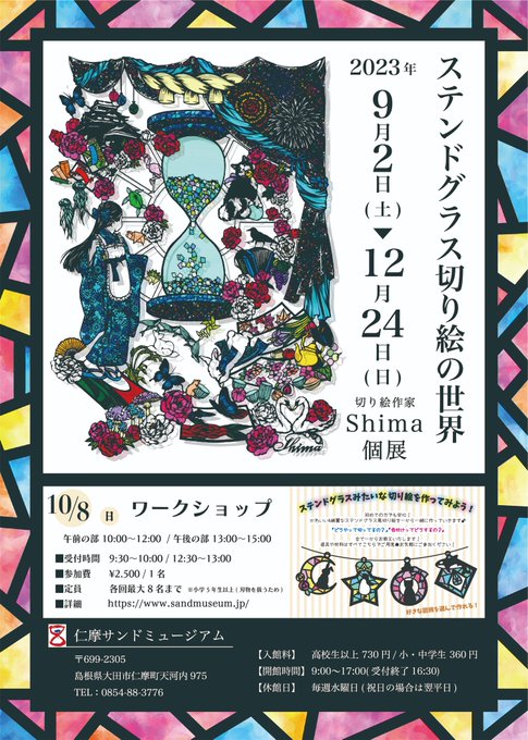 【次回展示会のお知らせ】 お待たせしました山陰地方の皆様! 初☆島根個展です! 『ステンドグラス切り絵の世界』 会期:2023年9月2(土)〜12月24日(日) 会場:仁摩サンドミュージアム ★ワークショップ開催★ 10月8日(日)参加費:2500円(道具、材料費込み) 詳細↓ sandmuseum.jp