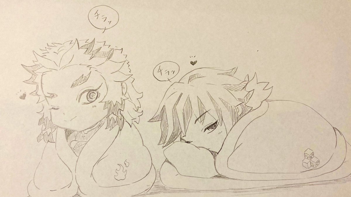 31 43 #ひらいて赤ブー 👹滅の刃 【杏花水月】 煉🔥杏🔥郎×冨🌊義🌊 継続開催よろしくお願いします🥰🙏 ペンタブ様が充電不足だったのでアナログになりました😭 おねむ🔥🌊この2つの相性良いなぁ~といつもこの並びにして愛でてます☺️💖💖💖 23/01/02 23:45