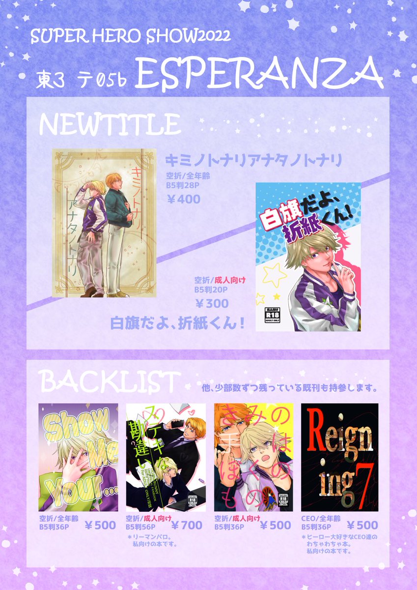 5月3日ヒロショのお品書きです! 調子こいて新刊2冊🙄 ここに載せてない既刊も少し持っていく予定です。 よろしくお願い致します🙏 リプ欄に新刊サンプルぶら下げときます。