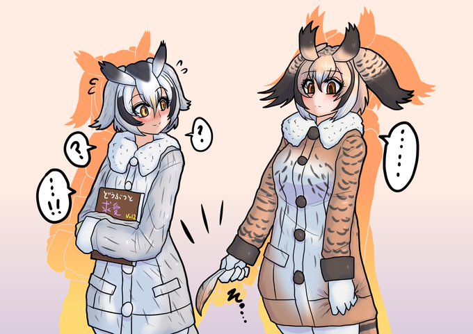[Pixivリクエスト]求愛ミミちゃん Pixivリクエストで、「羽根を渡して求愛するミミちゃん助手とちょっと困惑するコノハ博士」です。ベンガルワシミミズクが飼い主に羽根を渡す動画が一時期話題になりました。ご依頼ありがとうございました。
