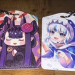 I got more key chain today~ Thanks @Hanh_R_A sensei for her great art work (left Ina and two Gura)💙💜💙💜 #TorontoComicon2023 #gawrt #inart