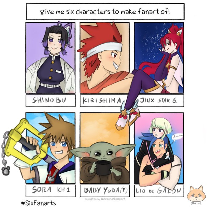 Here are 6 more! Thanks to @mirisaur @HuevitoEnojao @tryska_always @lucyx66 @Surgiote and theandriusmile for participating! 😘💞 #sixfanarts #Shinobu #kimetsunoyaiba #Kirishima #Bokunoheroacademia #jinx #leagueoflegends #sora #kingdomhearts #themandalorian #galolio #PROMARE