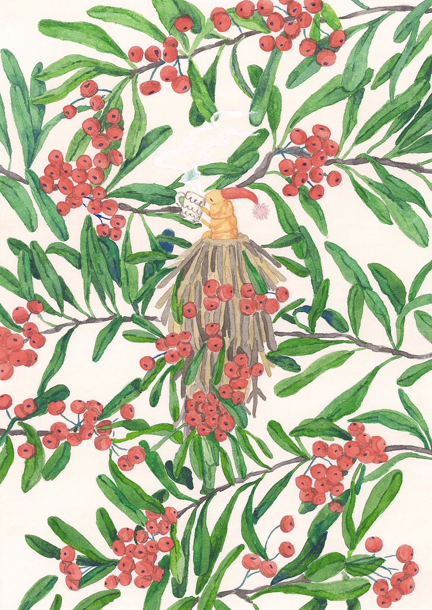 1 4 ようやく肌寒くなり、温かい飲み物と一緒に一息ついているミノムシ☕️ 近所にあったこの植物、そういえばクリスマスのモチーフとかでよく見かけるなあと思いつつ、なんの植物なのか知らないでいる🪴 #イラスト #水彩イラスト #虫 22/11/17 13:26