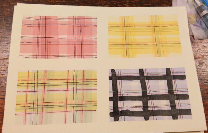 昨日、サトウヒロシ様のワークショップに参加し、そこで頂いたアドバイスを元に、顔料インクでチェック柄を描いてみました♪ カキモリ様でインクを揃えました! #インク沼