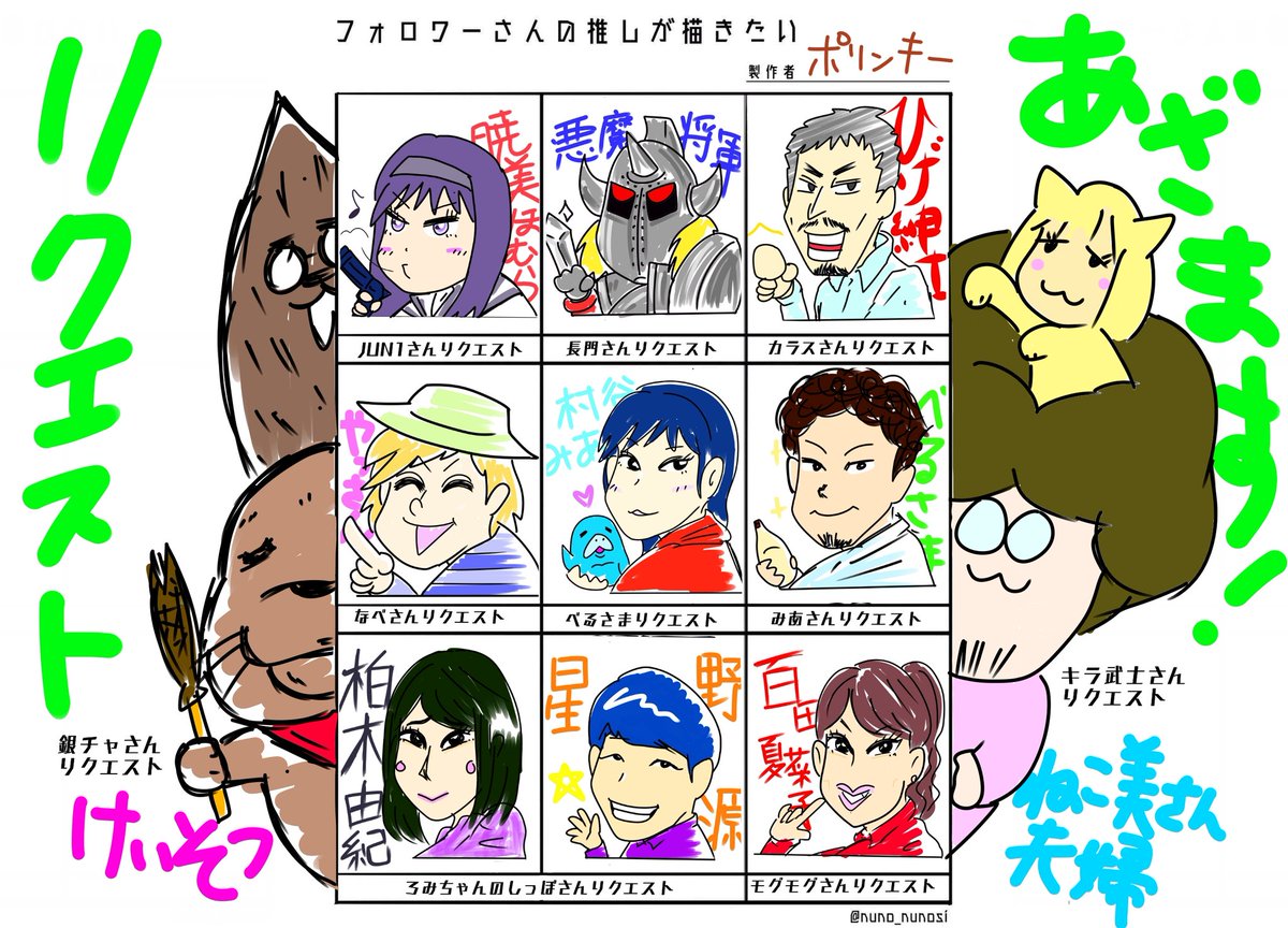 とりあえず四個時間かけずに描きました。全部終わったら一枚にまとめますね! ①なべさんリクエスト「やっさん」 ②みあさんリクエスト「イケべるさま」 ③べるさまリクエスト「村谷みあさん」 ④長門さんリクエスト「悪魔将軍」 #フォロワーさんの推しが描きたい