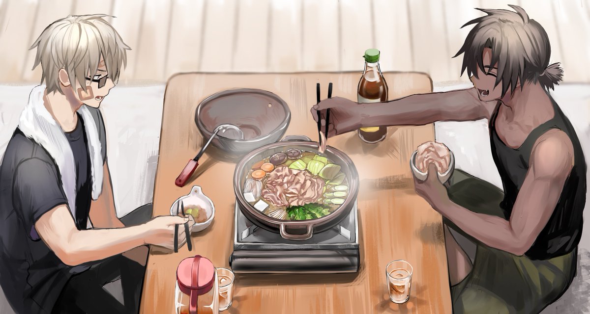 17 127 同室関係成立記念絵です 「肉ばっか食うな」 「安い肉見つけてきたんおれなんやからええやん!な!」 20/07/03 01:38
