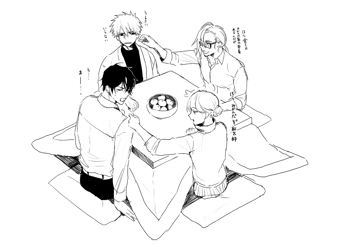 同室関係成立記念絵です 「肉ばっか食うな」 「安い肉見つけてきたんおれなんやからええやん!な!」