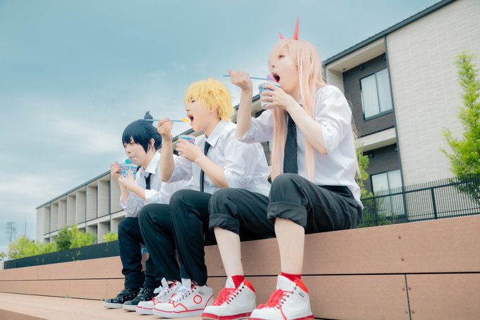 チェンソーマン/コスプレ⚠️ 早川家 🟡早パイ奢りあざーす 🔴でかしたぞ 🔵この後しっかり働けよ 🟡うわーベロの色変わってやんの〜 🔴デンジもじゃ!ハッハッハッ 🟡パイセンは〜? 🔵早く食えよ デンジ@kiku__hashi アキ@hnybaby 📷@TAKAcosphoto