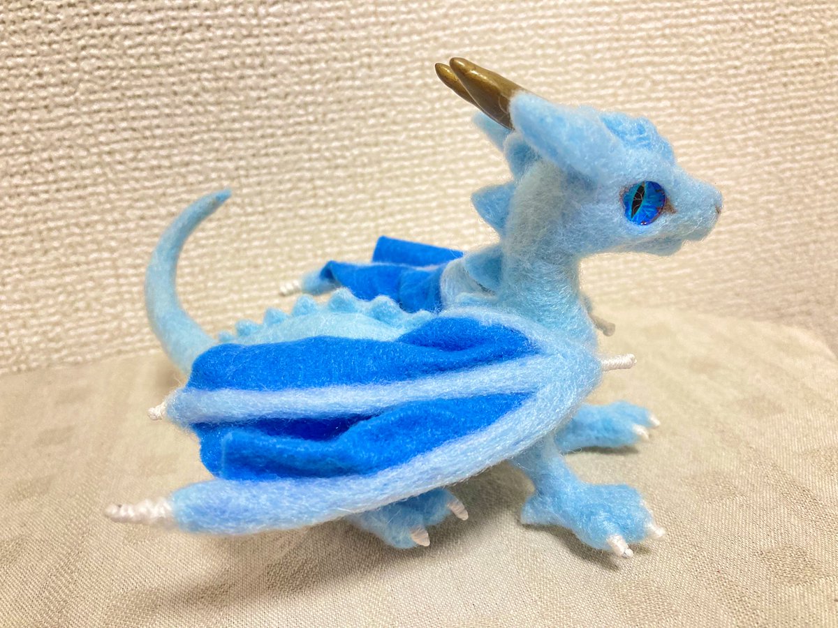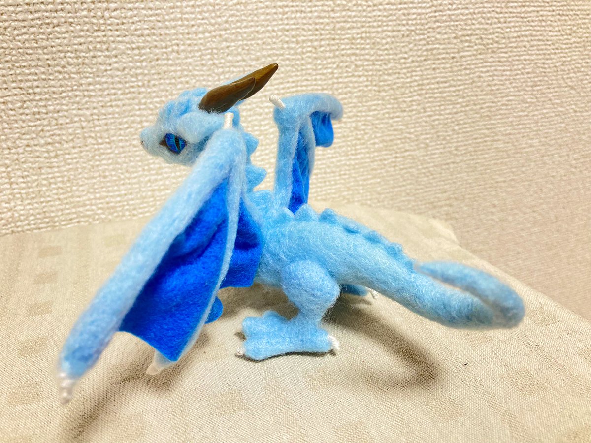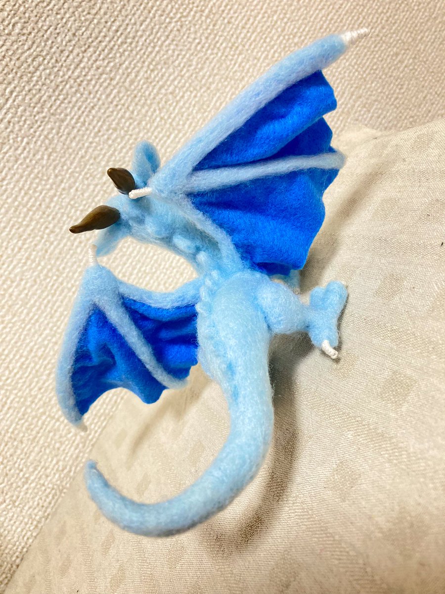 水色ドラゴン出来ました! この子は初めてオーダー頂いたドラゴンです!お迎え先決まってるので今にも主様の元へ羽ばたきたくて仕方がないご様子( ´ ▽ ` )✨ #羊毛フェルト #ドラゴン #オーダーメイド