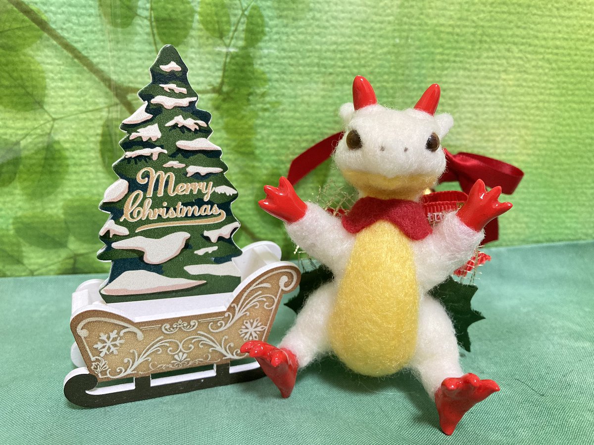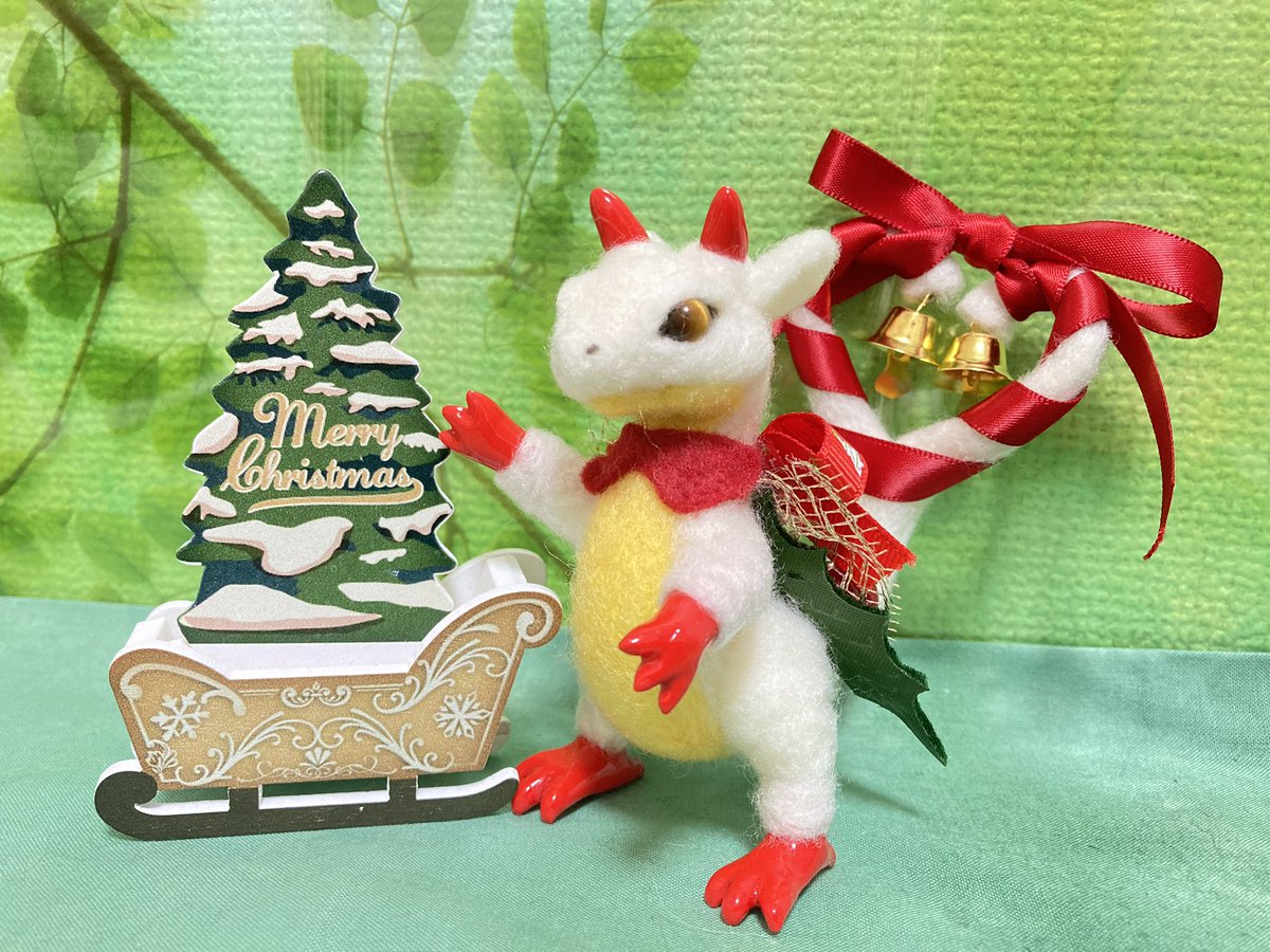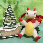 12 77 クリスマスドラゴン誕生しました‼️ 前にオーブン粘土で作った手足使ってみたんですが、大きさドンピシャで思いのほか早く生まれました😊✨ 尻尾はハート型に見えるかな? #羊毛フェルト #ドラゴン #クリスマス 22/12/24 03:59