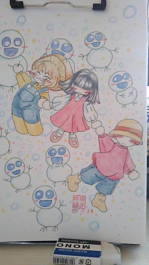 皆様方おはようございます❤落書き屋柴子味噌、本日は開店出来ました‼ 雪ダルマと3人組です❤ よろしくお願いいたします❤ #オリジナルイラスト #色鉛筆イラスト #冬のイラスト #イラスト好きな人と繋がりたい