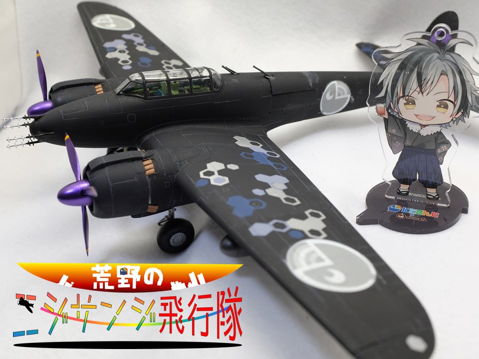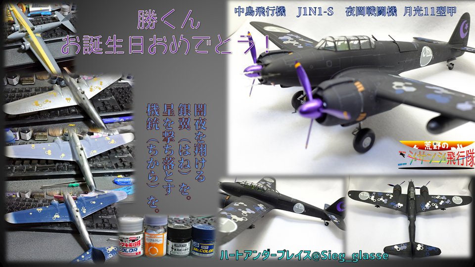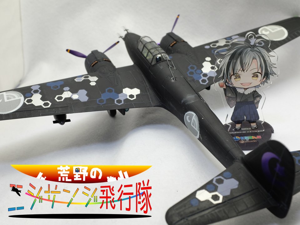 他、いろいろなアングルから 鈴木勝くんのファンマークが星と三日月で、漆黒の捕食者を名乗ってて、夜を翔ける夜間戦闘機月光がぴったりだと思ったので作りました ヘックス迷彩がサイバーっぽくなったかな #漆黒の水鏡 #鈴木勝誕生祭2020 #荒野のニジサンジ飛行隊 #48スケモ