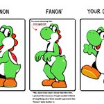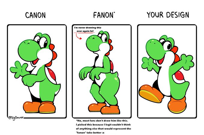 It varies depending on certain characters. I would either draw them close to canon, add my own spin to their designs, combine some of their official designs together into one, etc Yosh here is like a mixture of some of his official design traits that I find the most appealing! twitter.com/KirbyQuestions…