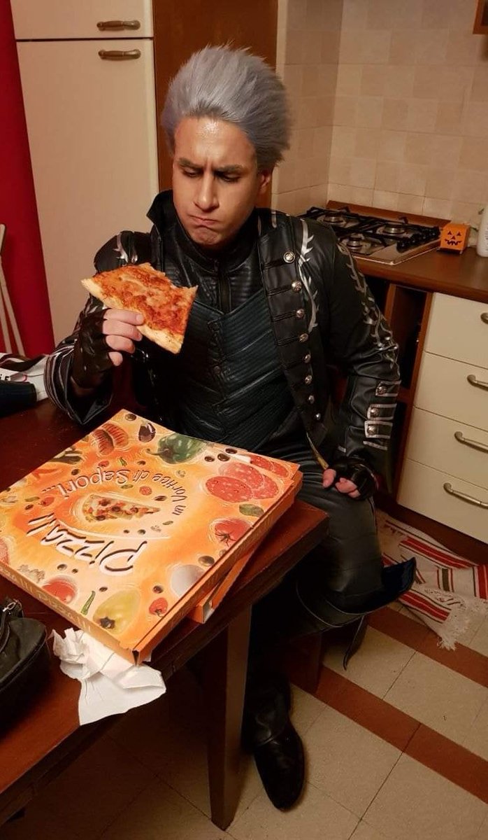 ..and Dante was like "you have to try this thing!" What form of carbohydrates is this? Old pic of a deadbeat dad trying pizza, taken a year ago. #DevilMayCry5 #DevilmayCry5SpecialEdition @DevilMayCry #capcom #vergil #cosplay #pizza