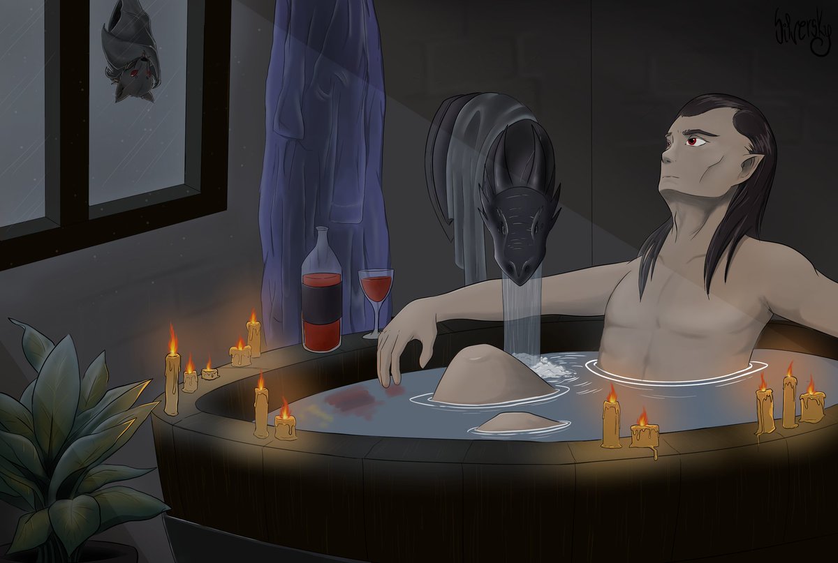 Un gros dessin qui m'a prit beaucoup de temps à réaliser. Issu d'un petit délire vis à vis de DnD et de Curse of Strahd où le Seigneur se relaxe dans son bain. Et dralucas la chauve souris trop poupou à la fenêtre <3 #dndart #curseofstrahd #dnd5e