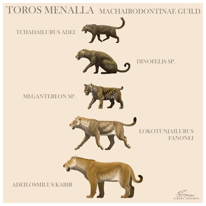 MEGANTEREON SP. The Dirk-toothed Megantereon is usually associated with Pliocene and middle Pleistocene faunal assemblages. A jaw found in the Chadian site of Toros Menalla, dates the origin of Megantereon back to Late Miocene, around 7 Mya. #paleoart #megantereon