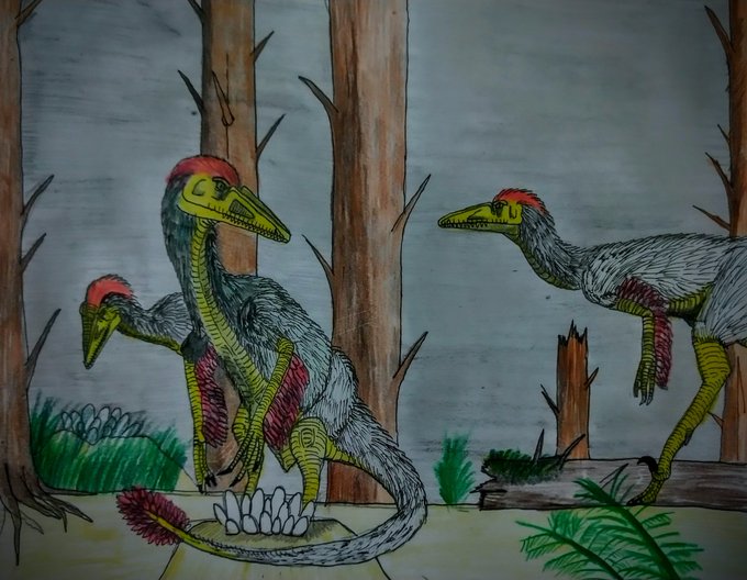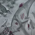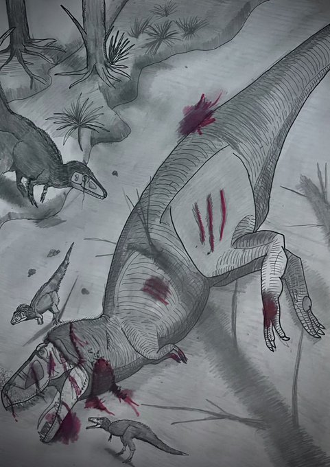 今日のお絵描き フタロンコサウルスの死体に群がるメガラプトル達 メガラプトルの腕がドロマエオサウルスの仲間並に器用に動くと聞いて器用に切り裂くシーンを描いてみたくなりました! 最近のマイプと言い、これから新たな化石がどんどん見つかると良いなぁ… #メガラプトル #フタロンコサウルス