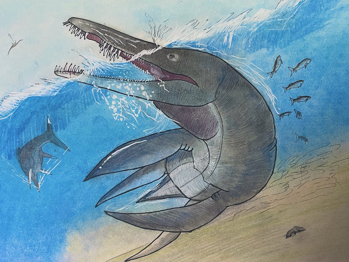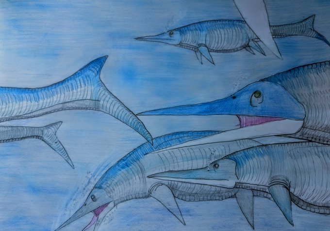今日のお絵描き 魚竜を追いかけて座礁した #リオプレウロドン 海生爬虫類最強と言われるハンターでも狩りに失敗する事があると伝えたくて描きました! 実際首が短い首長竜の狩りの成功率ってどれくらいなんだろう…?🧐ある説だと狩りは待ち伏せ方だからかなり成功率は低いのかな…? #Liopleurodon