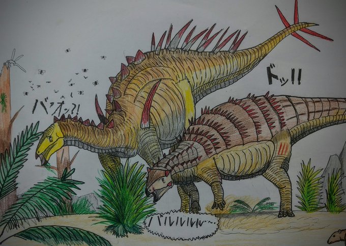 今日のお絵かき 食事中のアドラティクリットに思いきりタックルするスピコメルス 最近見つかったばかりの新種をとうとう描けました! 彼が本当に鎧竜類かどうか怪しくなってるみたいだけどとりあえず今回は原始的な鎧竜類として描かせてもらいました(⌒▽⌒) #スピコメルス #アドラティクリット