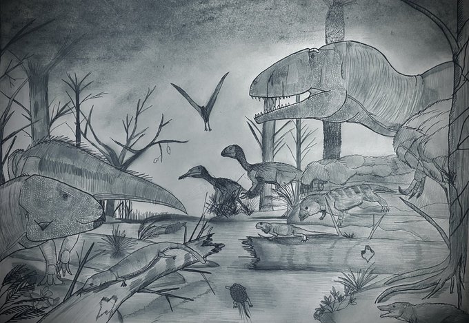 今日のお絵描き #ティラノサウルス スーの最後 #BEASTARS のED テーマ #優しい彗星 をのラストサビをイメージして描きました 戦いに負け、子供達に見取られながら死ぬ設定… 下顎や腰の傷や足にある痛風の跡などは実際にあったらしい物を再現しました #Tyrannosaurus #fmnhpr2081 #Tyrannosaurussue