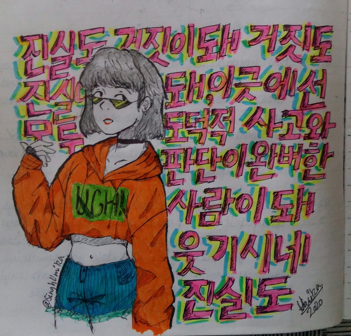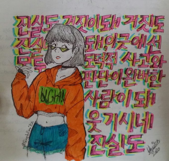 " Even the truth becomes a lie and lies become truth. In here everyone becomes a person with moral thinking and perfect judgement, it's funny" -yoongi,UGH! I drew UGH! as a bada$$ female character, and sorry if there are any mistakes in my korean handwriting😅 #bts #btsfanart
