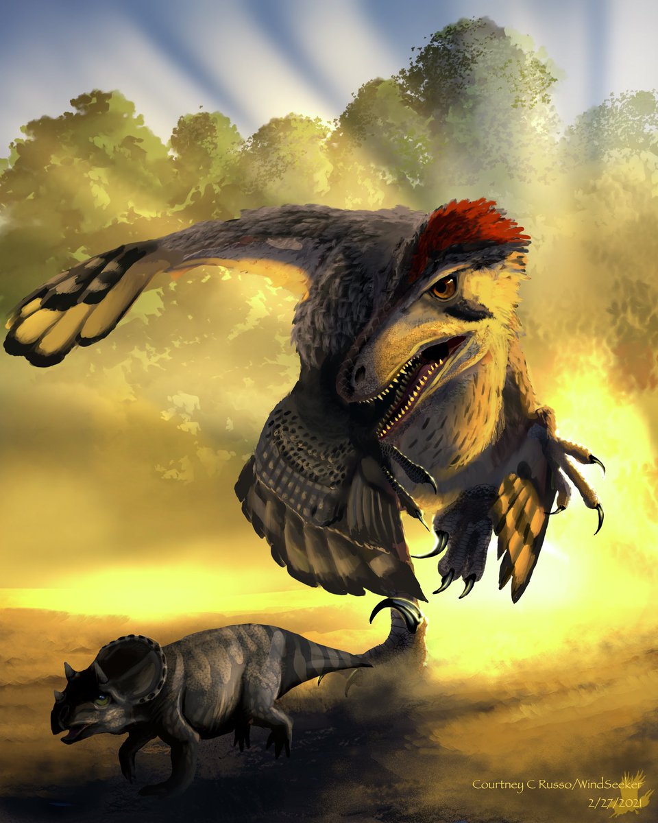 “The Chase” featuring a Dakota raptor & a hatchling triceratops in Procreate #artpost #paleoart #procreateart feedback is welcome!