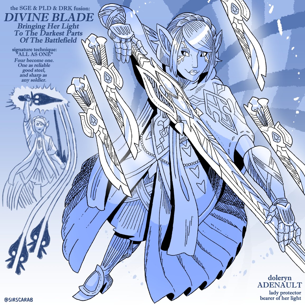 "Dark seasons' design and Spring's promise of sun are honored, as the Darklight unleashes her soul." The WHM x DRK x RPR job fusion for @Zoe_Daxa! [#ffxiv#ffxivart]