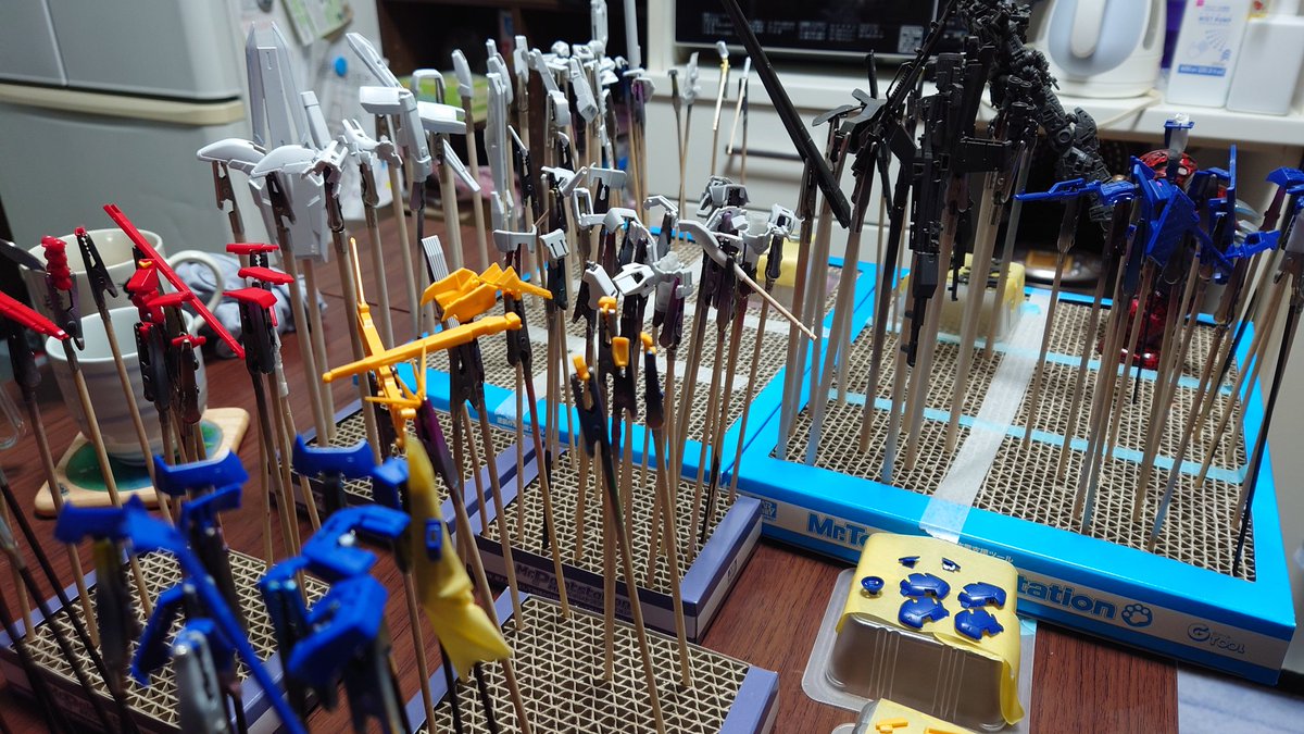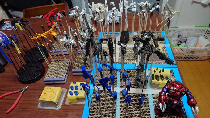 バラし終わったー!! 持ち手残り2本やった…(;^ω^) ドでかいナイチンゲールからのー 細いRGffνガンダム… ギャップにやられそうな週末です😖 #ガンプラの画像貼るとRTされると聞いて