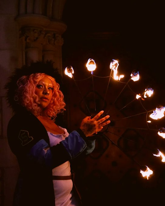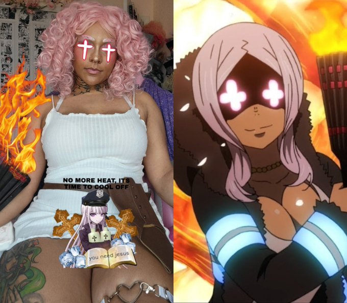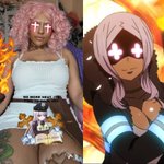 Captain Hibana of special company 5 and third generation pyrokinetic flame princess !❤️🔥🏩👸🏾 pics shot at a church! (Fire fans are real do not try this at home I am a trained pro) #FireForce #superbowlsunday #hibanacosplay #firefans #blackcosplay #fireperformer #cosplay #hibana