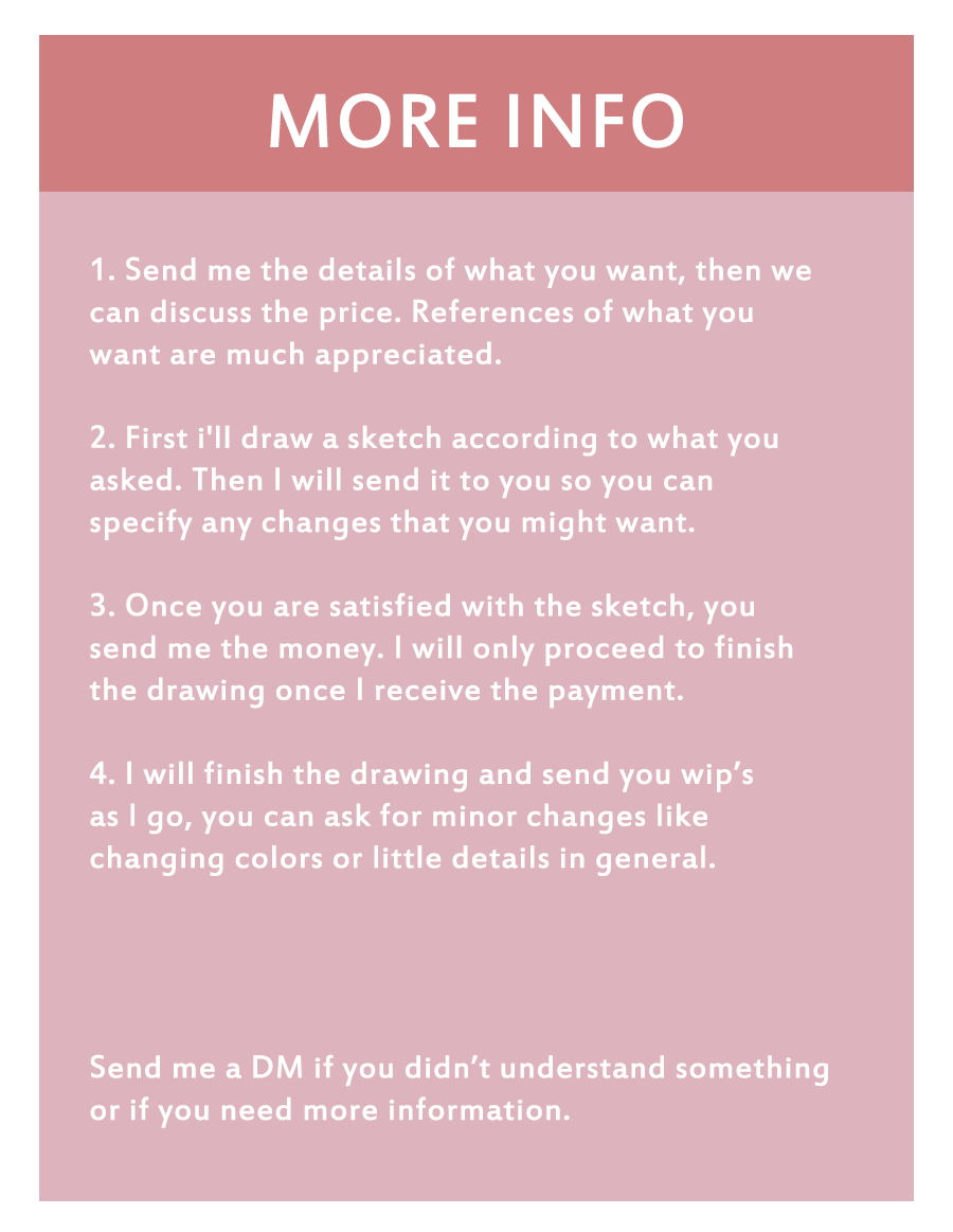 41 69 I'm opening commissions, it's been a while so just 3 slots for now if you have doubts feel free to ask via dm or discord 22/01/19 09:53