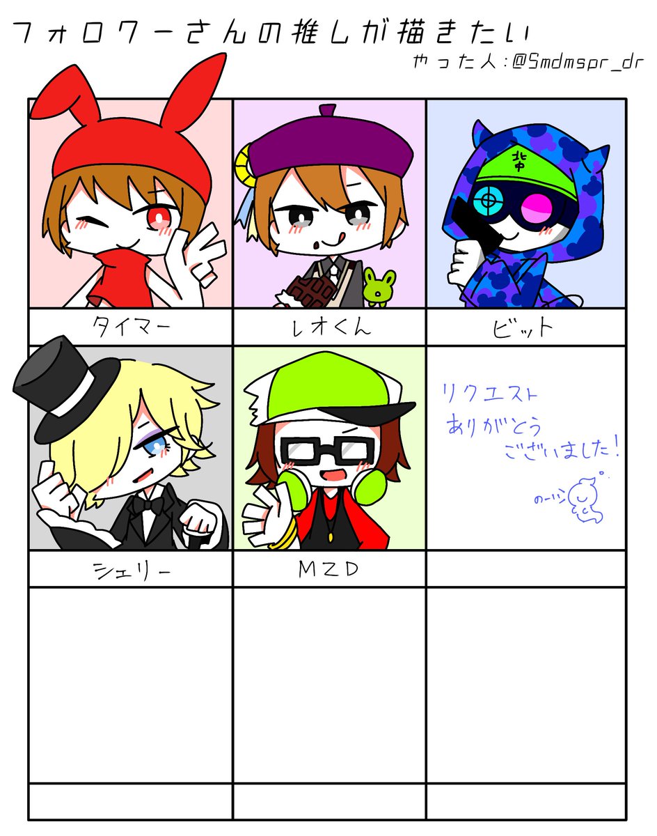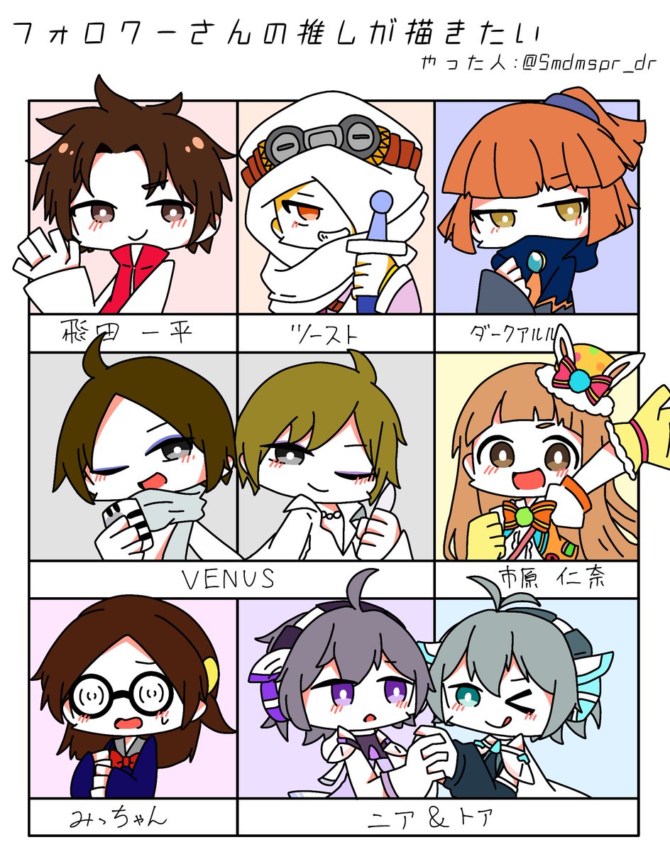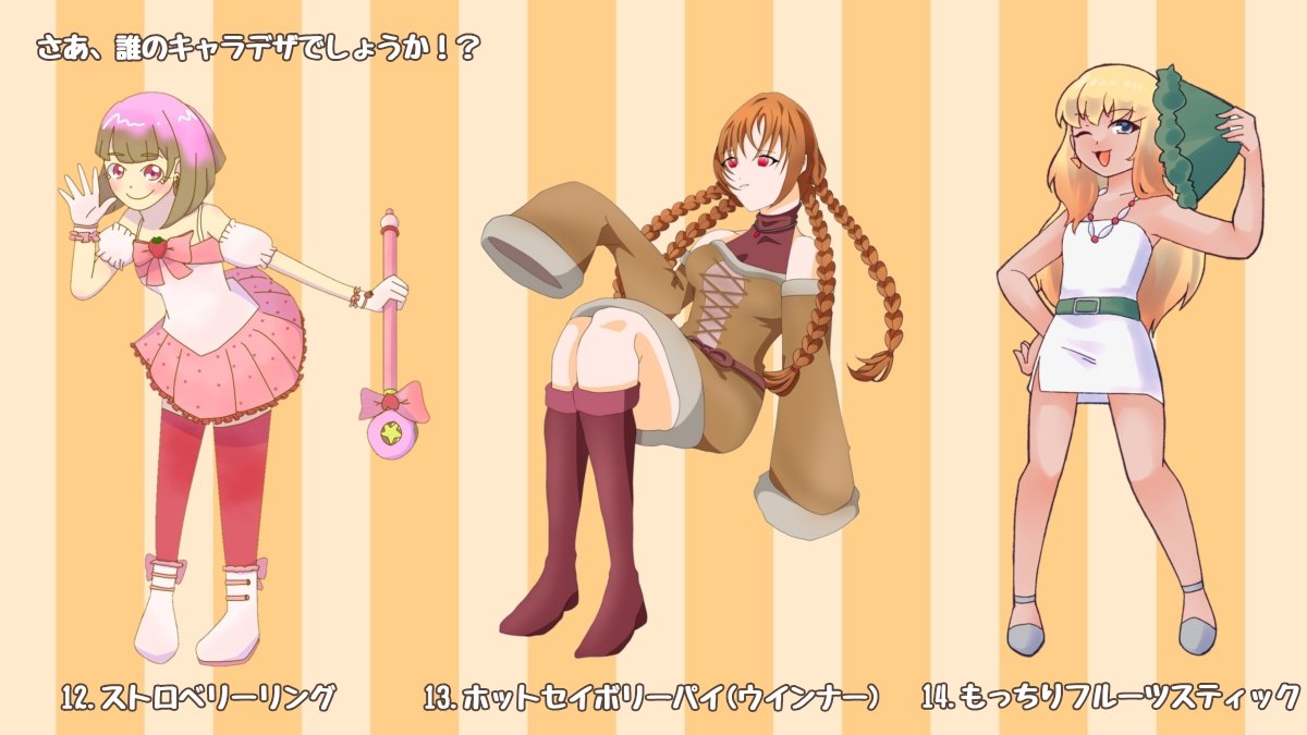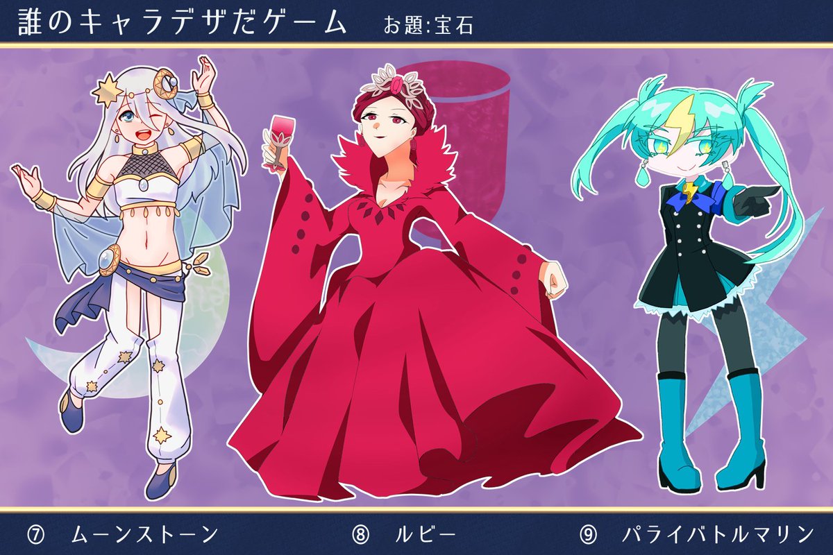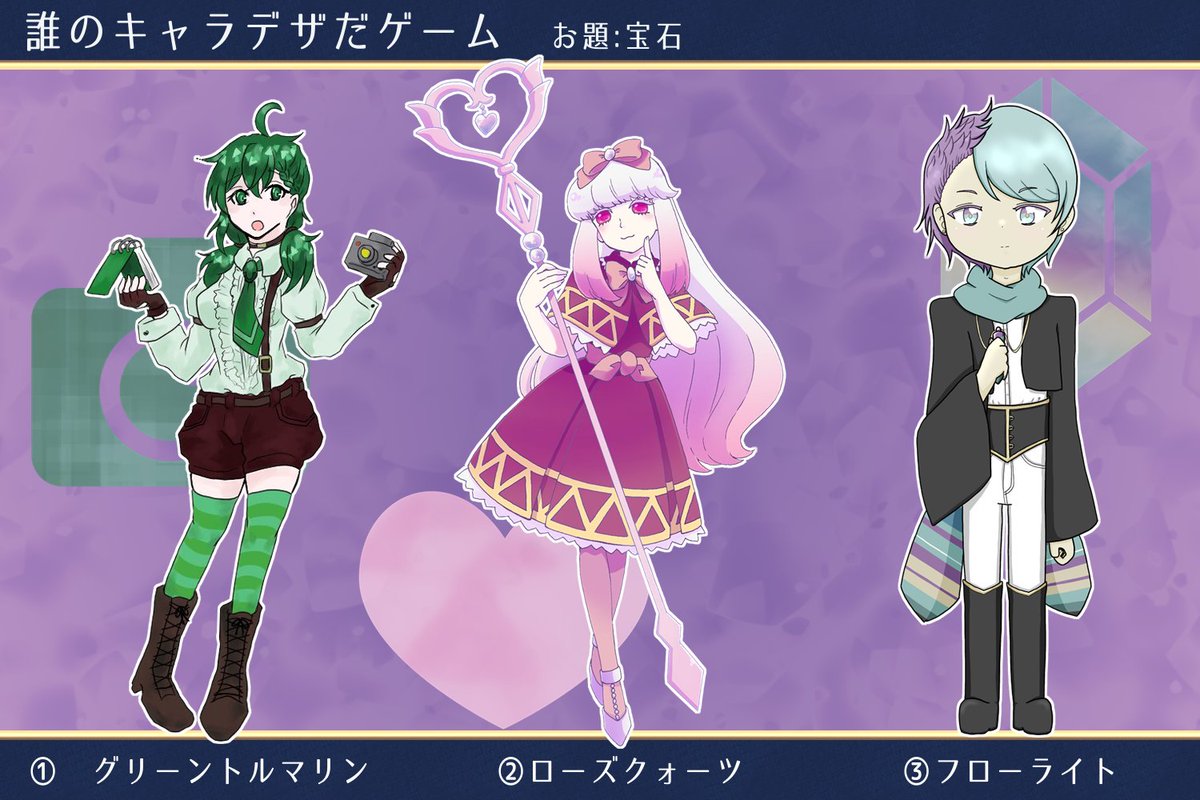 #誰のキャラデザだゲーム eiryさん(@noomeiry)主催の誰デザゲームに参加させていただきました〜!!私は⑥のチャロアイトちゃんを描かせてもらいました💊 リプにアンケ載せときますので私がデザインした子が誰か当ててみてください🙌