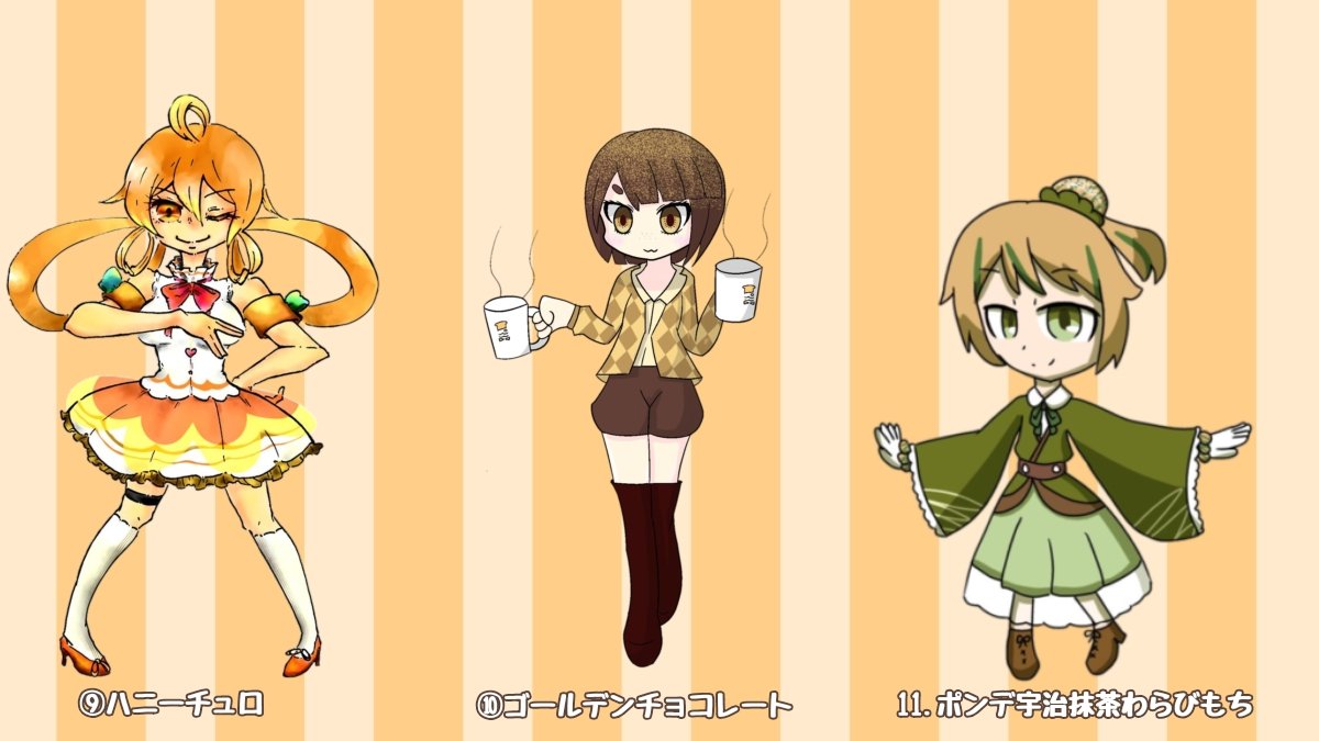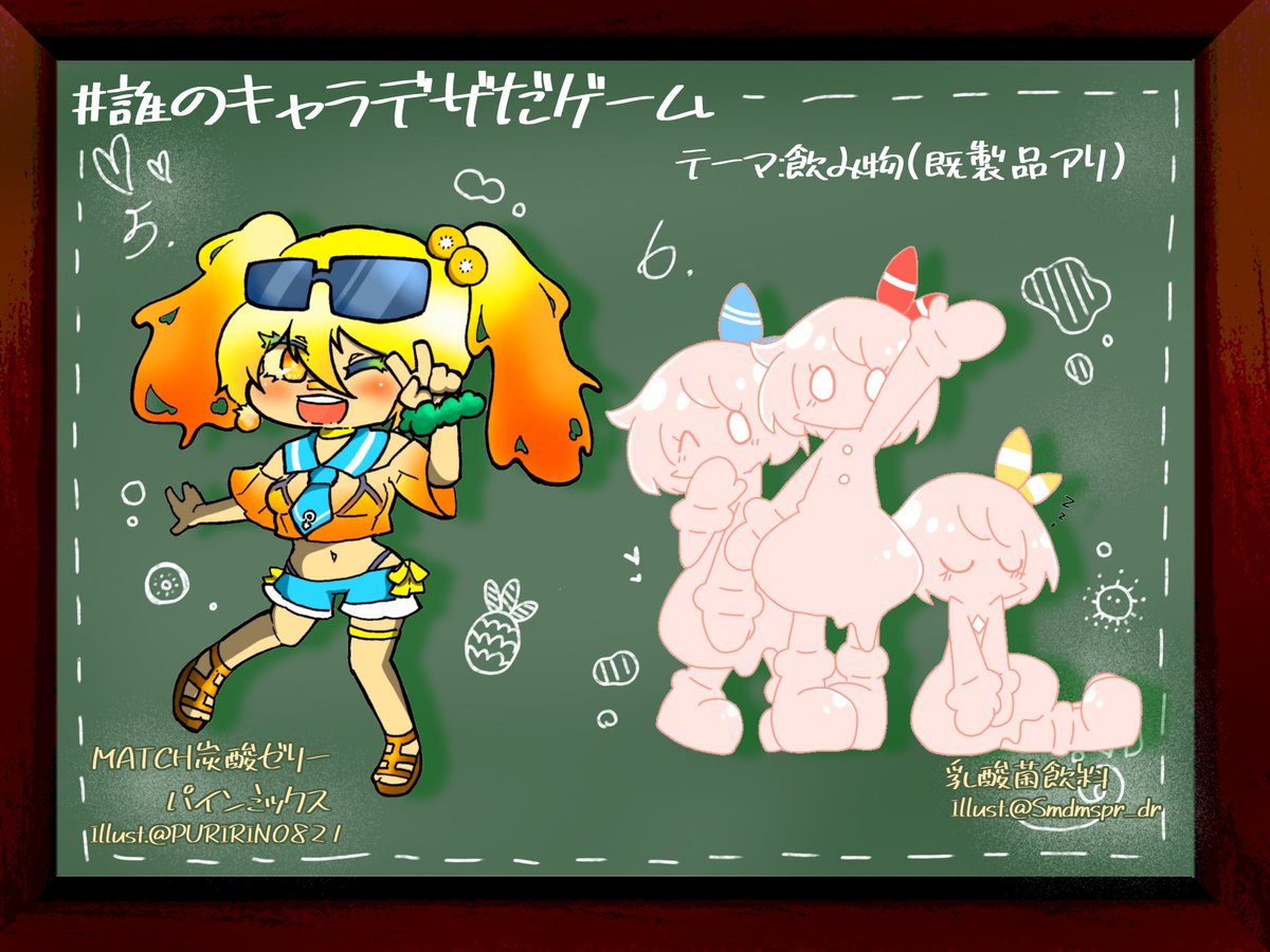#誰のキャラデザだゲーム 重低音さん(@Jyuteine_Solid)主催の誰デザに参加させていただきました!🙌✨私は6番の乳酸菌飲料ちゃんを描きました😌 リプにアンケート載せときますのでどの子が私がデザインした子か予想してみてください〜!!