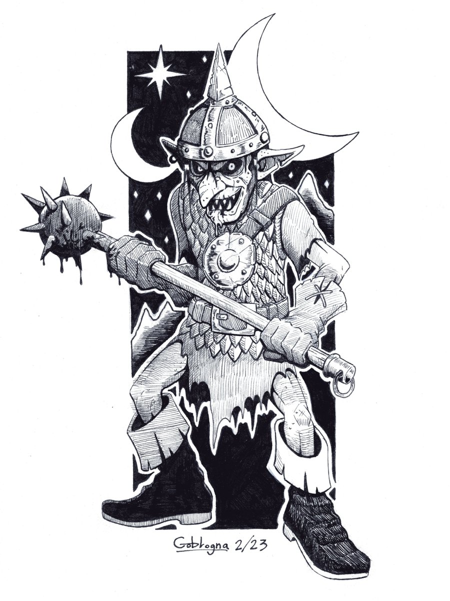 I'm always trying different ways to draw chainmail to see what looks best. I sketched this goblin to try out something different, though I think it looks more like scale mail. #dnd#dndart#ttrpg#osr#goblin#sketch