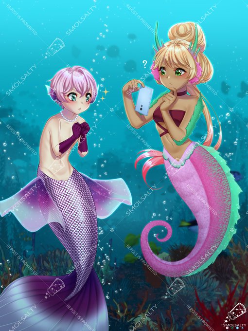 "Maka: Mmh what's that thing? Gimmy: Ooh I know, humans drop them everytime in the ocean! I think they call it a "fone" or something?" Entry done for @akanekyoko40080 and @AkaneRitsu1 's contest! It was very fun to experiment :D #akanesmermay2021 #mermay #mermay2021