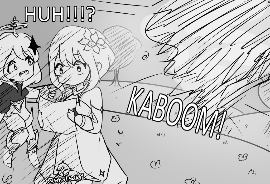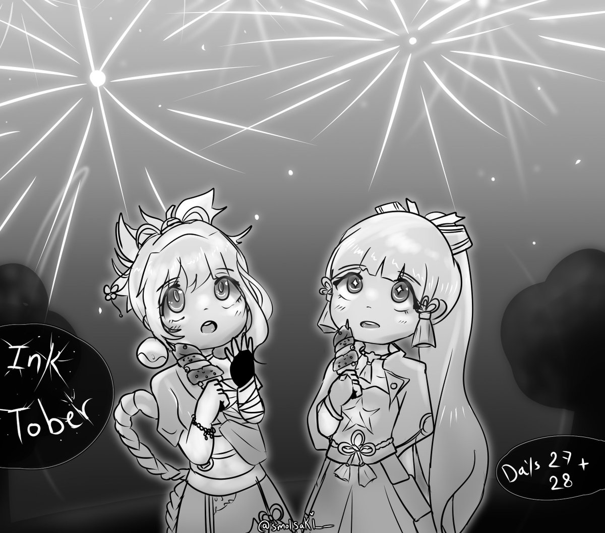 #Inktober days 27 and 28 because I took a day's break oop Themes were "Spark + Crispy" It turned out cute 🥺🥺 #inktober2021 #GenshinImpact #ayaka #Yoimiya #楓原万葉生誕祭2021 #原神