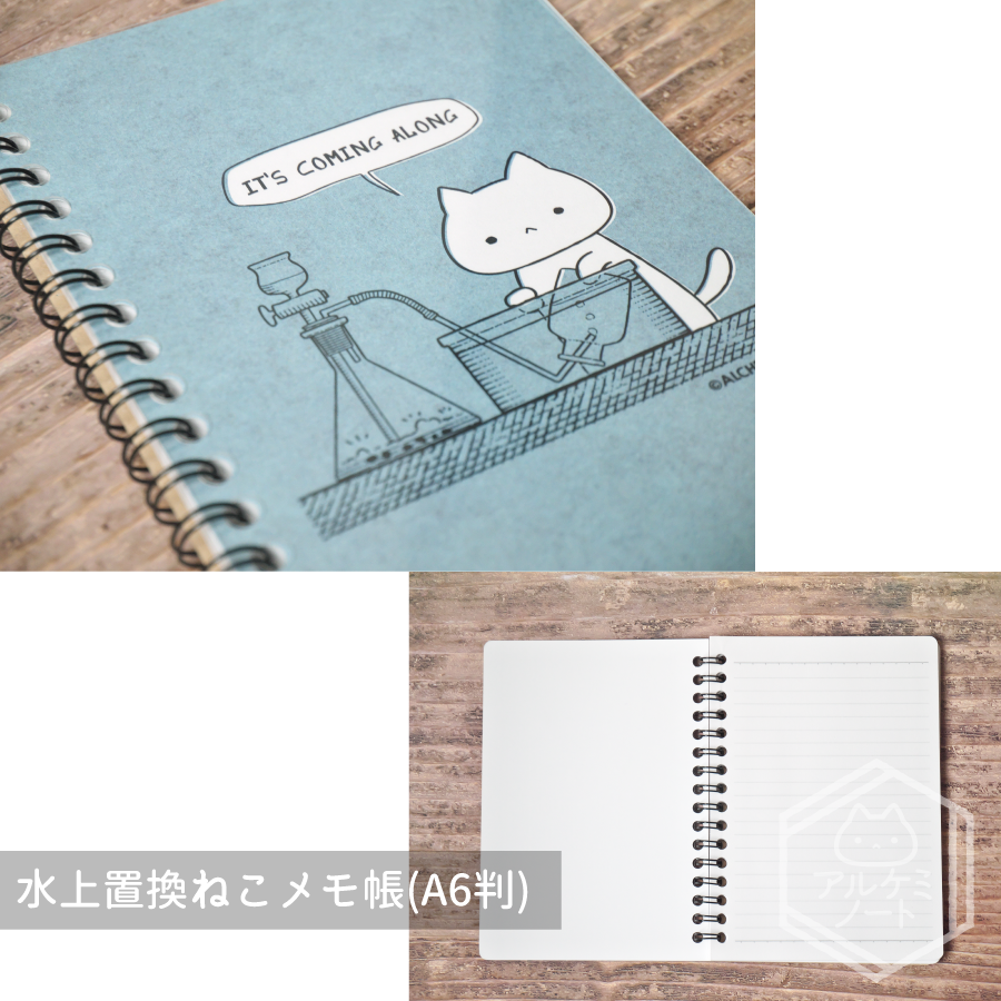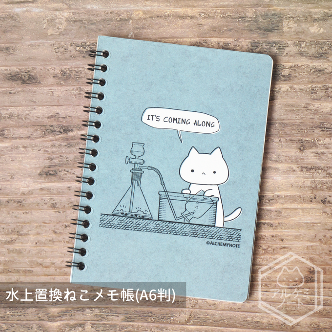 #2023年アルケミノート春の新作 ①水上置換ねこリングノート 理科ねこが気体を集めているよ! "It's coming along."(順調に進んでる) フラグでしょうか。フラグでしょうね。 【サイズ】A6判