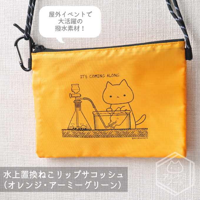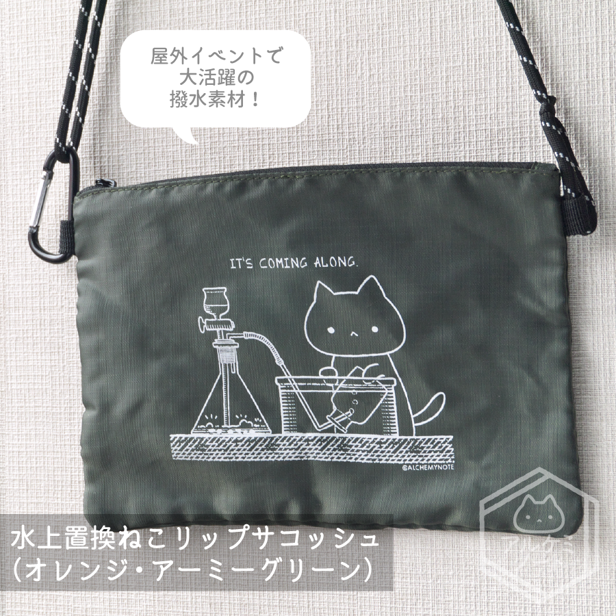 #2023年アルケミノート春の新作 ②水上置換ねこリップサコッシュ フェスに!アウトドアイベントに!撥水素材のサコッシュです。 写真からはみ出ましたが、首にかけられる長さの紐がついてます(長さ調整可)。 カラビナにキーホルダーや消毒ジェルボトルケース付けてお出かけだ('ω')ノ