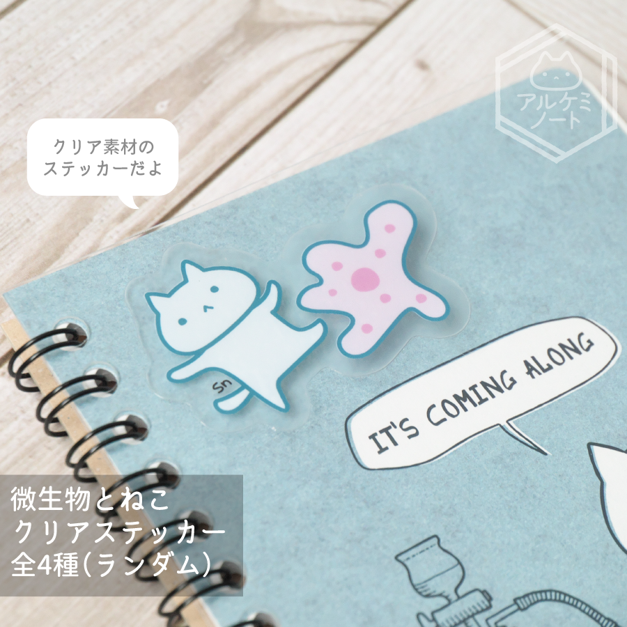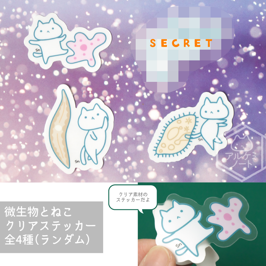 #2023年アルケミノート春の新作 ⑤微生物とねこ透明ステッカー(ランダム4種) 微生物とねこの透明ステッカー🦠 アメーバ、エスガタケイソウ、ゾウリムシ、シークレットの全4種! どれが出るかな('ω')