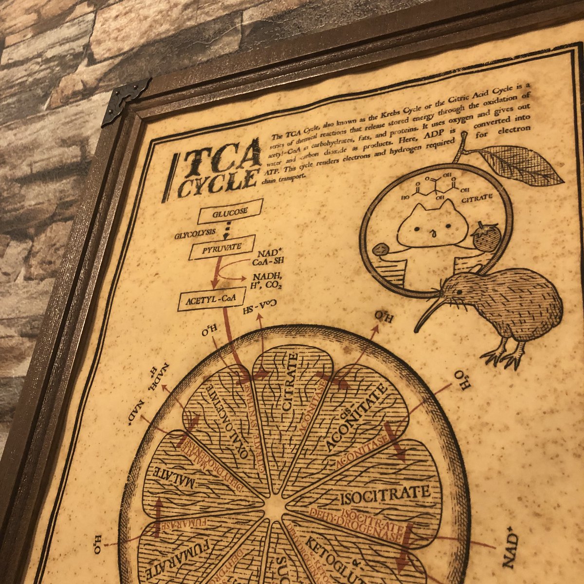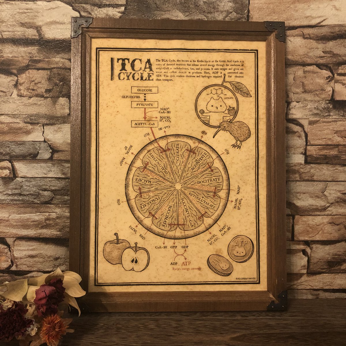 #2023年アルケミノート春の新作 ⑦クエン酸回路ヴィンテージ風ポスター なんと10年ぶりのリメイク。 高校生物の中ボス、みんな大好きクエン酸回路(TCAサイクル)の図です。 コーヒー染めしてヴィンテージ風に仕上げました。 キーウィ…はなんでそこにいるんですかねぇ? 【サイズ】A4判