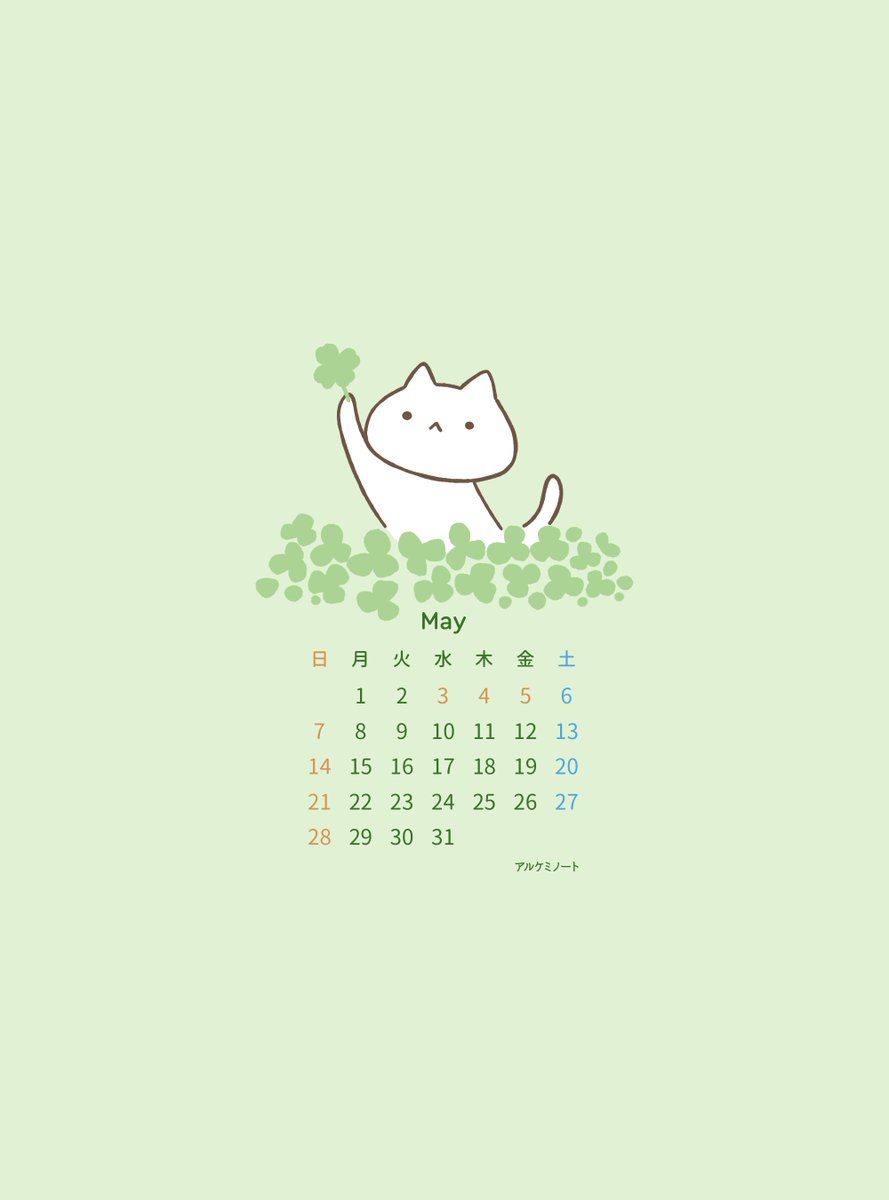 #理科ねこ壁紙カレンダー 5月>(っ'-')╮ =͟͟͞͞☘️☘️☘️🍀ブォン みーどり みーどり みーどーりー🍀 スマホのロック画面への設定推奨。周囲に余白があるので画面サイズに合わせて良い感じに調整してね。