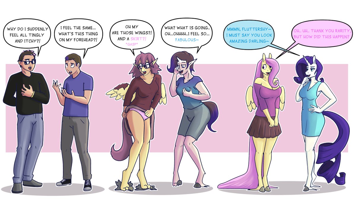 Hi Hello, it's been a minute! Today I have a really fun pony tf for furaffinity.net/user/dtops77 and furaffinity.net/user/nitter/ of them transforming into Rarity and Fluttershy. Enjoy! And don't forget to #TFEveryday #Furryartist #anthro #mlp
