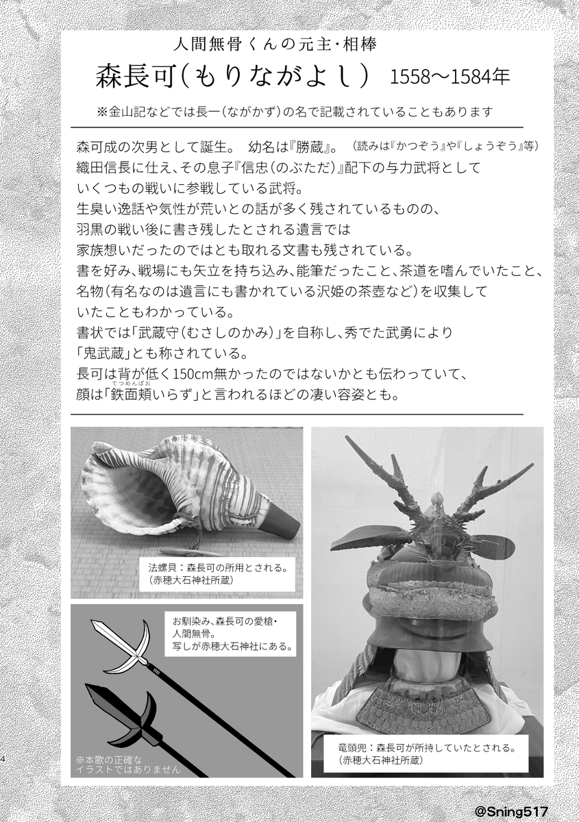 刀剣男士『人間無骨』とその元主『森長可』に関する内容を軽くまとめ、人間無骨がその地に訪れているような旅行本を作りました。 内容はpixiv上ですべてみることが出来ます。(紙の本としても発行しております) ご興味を持っていただけましたら幸いです! pixiv:pixiv.net/artworks/11093…